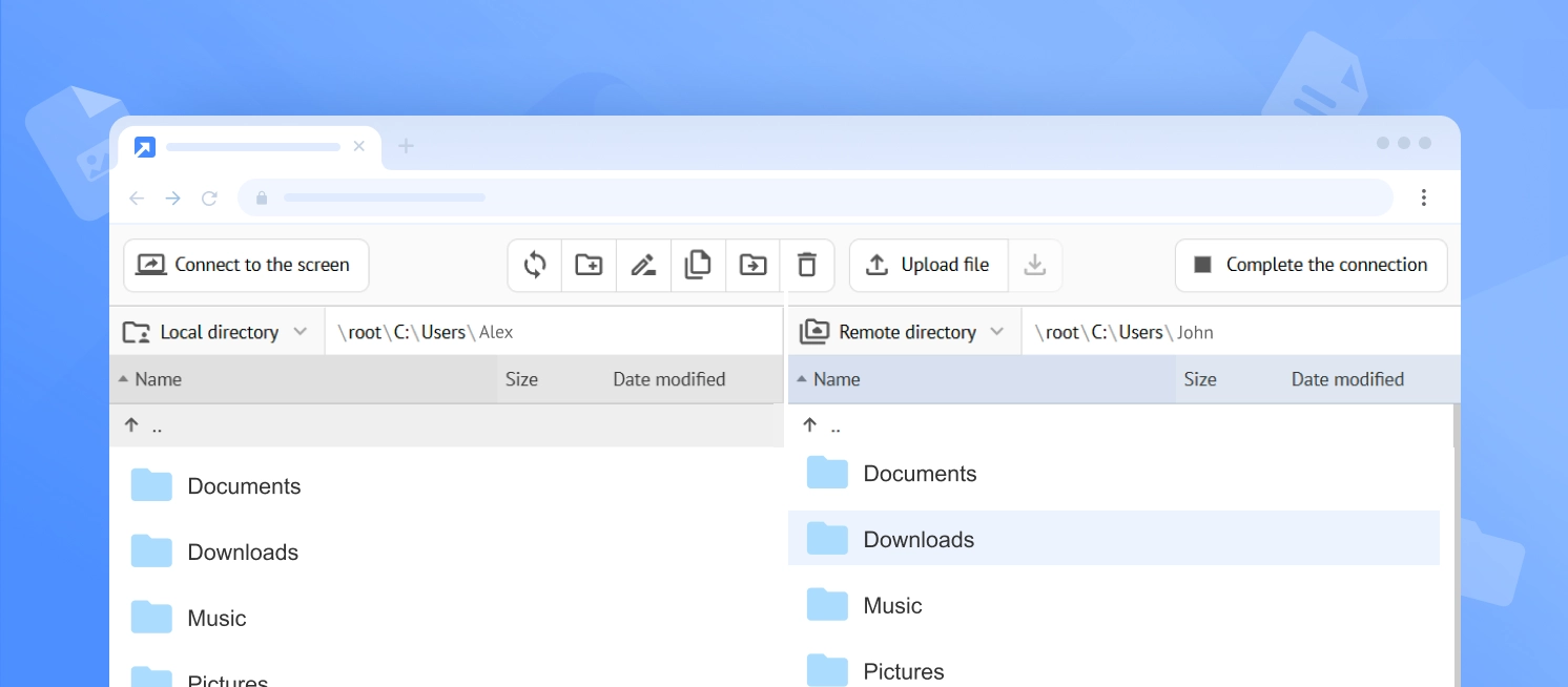 Introducing our new parallel connection mode, "File Manager". This feature mimics traditional desktop file managers like Far Manager and Total Commander, displaying two lists of file structures: one for the operator's local machine and the other for the remote machine.