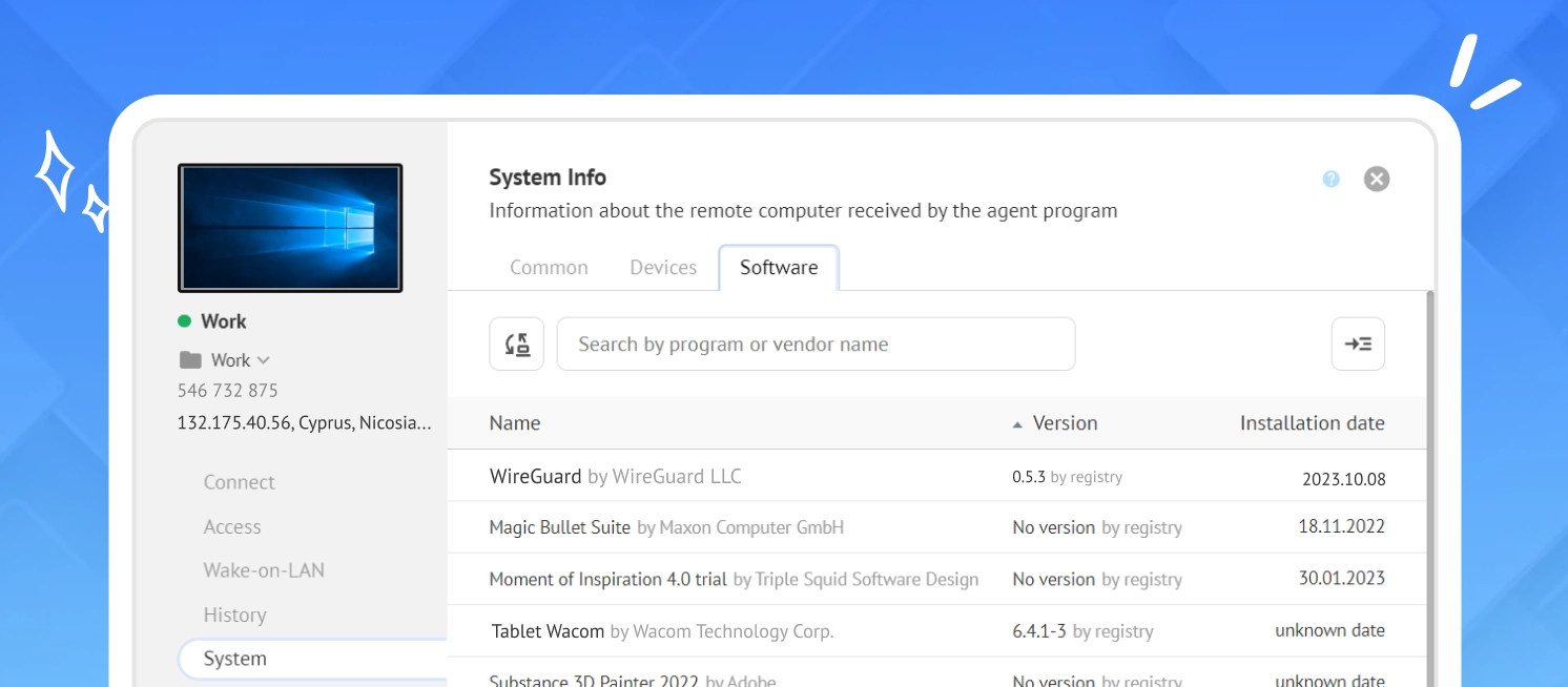 We launched the first version of the Software subsection in the Permanent Access section of your personal account. This feature allows you to monitor and manage the versions of software installed on connected devices. It’s perfect for tracking outdated or vulnerable software, helping you maintain security and efficiency.