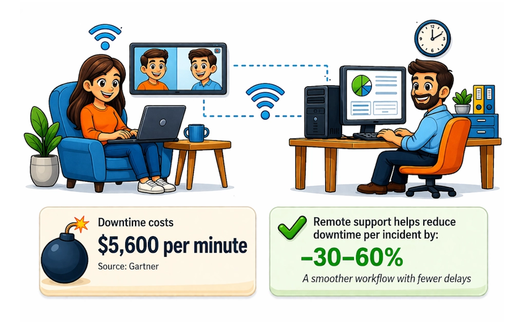 Remote access software for small businesses removes these obstacles. A technician connects instantly and starts troubleshooting without travel. Most issues are resolved during the first session.