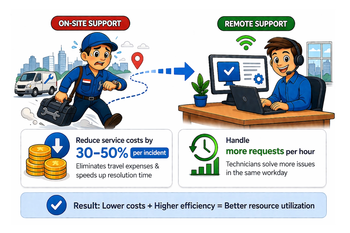 This difference has a measurable financial impact. Industry estimates show that remote support can reduce service costs by 30–50% per incident, mainly by eliminating travel and reducing resolution time. At the same time, technicians handle more requests within the same working hours, which improves overall resource efficiency.