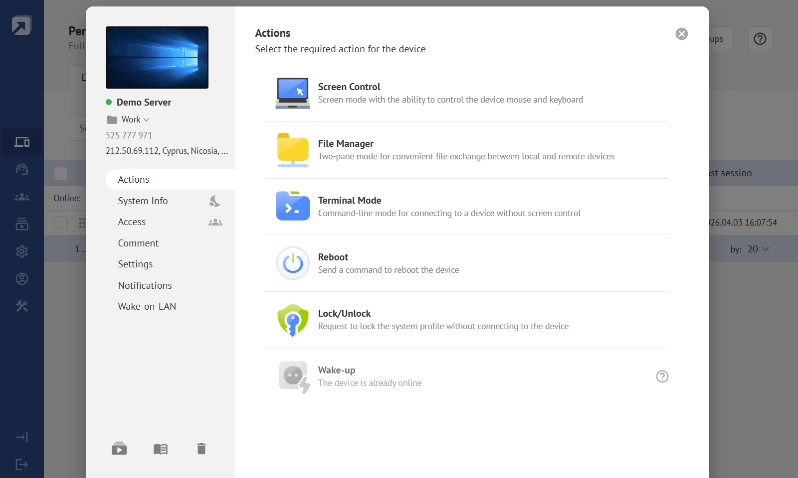 Teams can monitor all devices in a unified dashboard, giving specialists instant visibility into their status. They can quickly connect and perform necessary actions without switching between multiple systems.